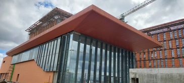 Facades: A curtain wall is a cladding system, made of contiguous elements, which envelopes the building structure on which it hangs like a curtain and excludes wind and weather, includes the air-conditioned environment, but resists no building loads. It generally has an aluminum frame structure and glass vision panels with spandrels which can be made of glass, metal, stone, compressed cement or composite panels. A successful curtain wall is the product of an experienced and specialized team of designers, fabricators and installers.